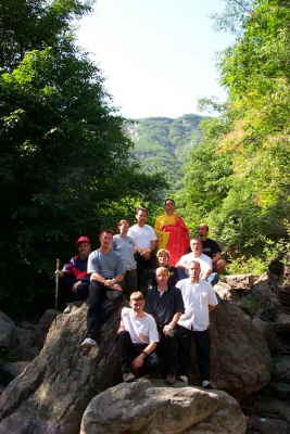 Gruppenfoto mit Shaolin-Mönch an den Drachenseen in Shaolin
